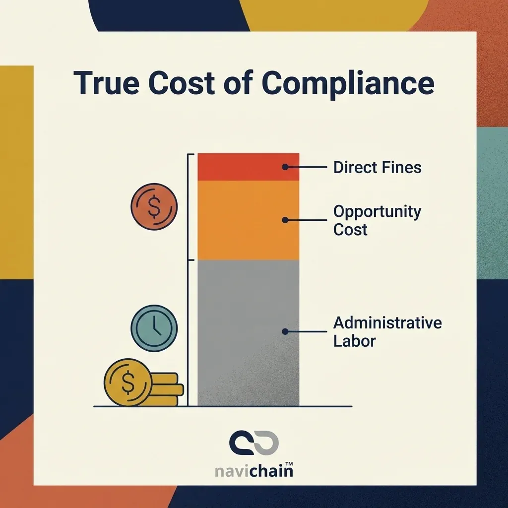 [IMAGE: chart - A breakdown of the "True Cost of Compliance": Direct Fines vs. Administrative Labor vs. Opportunity Cost. The administrative portion is shown to be the largest hidden cost.]