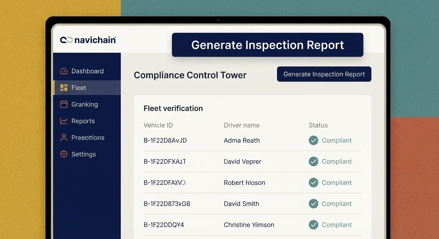 [IMAGE: navichain - A UI shot of the Navichain "Compliance Control Tower". It shows a fleet verification list, green "Compliant" ticks, and a "Generate Inspection Report" button prominent.]