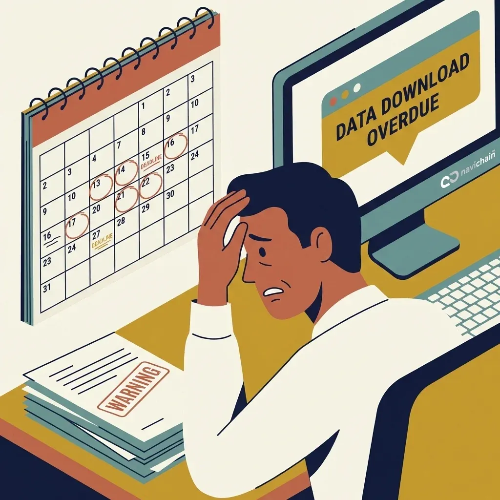 [IMAGE: problem - A close-up of a stressed fleet manager looking at a calendar with circled deadlines and a stack of warning letters. A "Data Download Overdue" notification is visible on a dusty screen.]